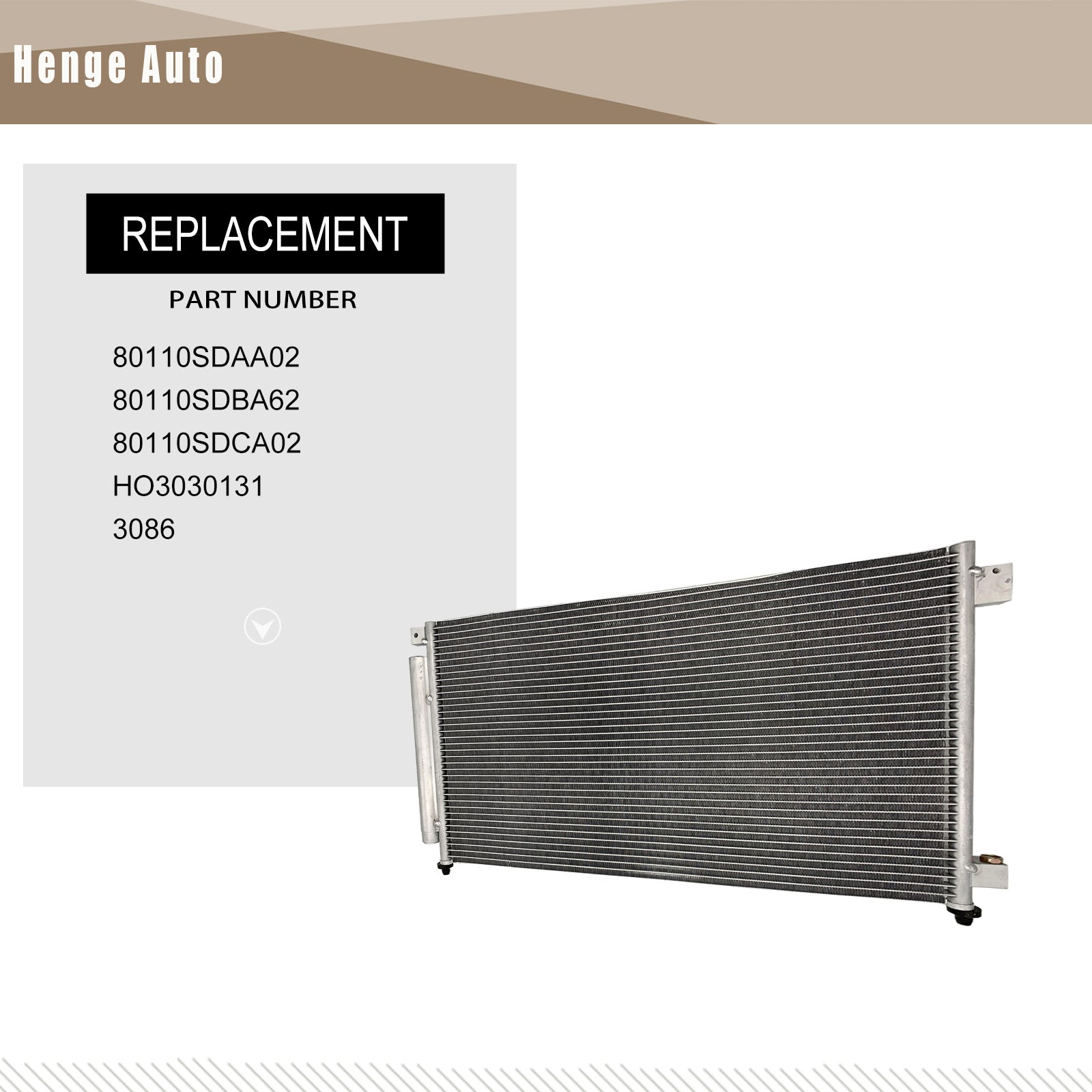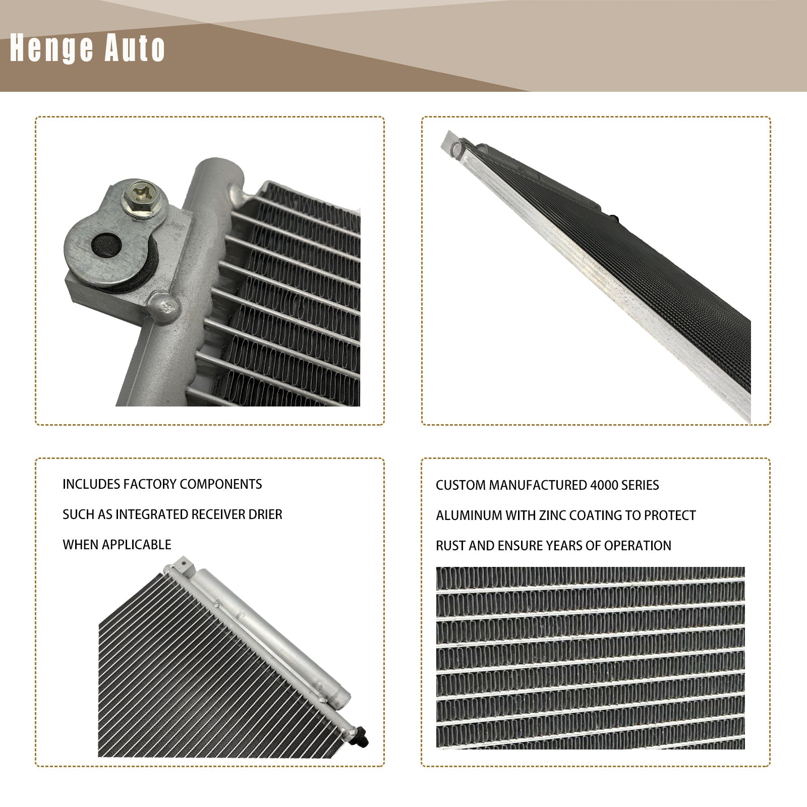 Henge Auto Air Conditioning Condenser can quickly help keep your cabin cool in the hottest weather.Innovative designs,such as fast heat transfer louver core fins,help the condenser to provide great cooling performance.At the same time,every condenser is manufactured to factory specifications for easy installation.